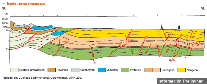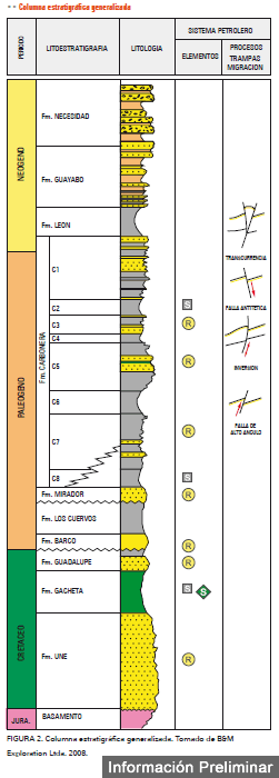 La principal roca generadora en esta área son las lutitas marino-continentales de la Formación Gachetá, localizadas por debajo del flanco oriental de la Cordillera Oriental (Figura 2). Estas rocas poseen un Kerógeno tipo II y III, rangos de TOC entre 1-3% y un espesor efectivo de 150-300 pies.