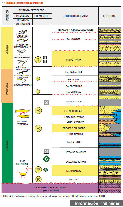 Dos eventos anóxicos mundiales en el Albiano medio y Turoniano son los responsables de la deposición de lutitas y calizas con alto contenido de materia orgánica en las formaciones Tetuán, Bambucá y La Luna (Figura 2). El Kerógeno predominante es tipo II, con reflectancia de vitrinita (Ro) entre 0,5 y 1,35. Temperatura máxima 450 y TOC > 5%.