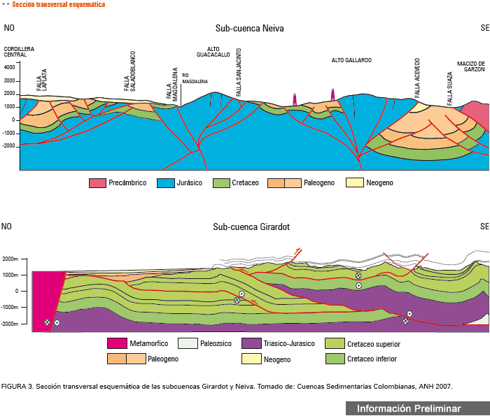 La Cuenca Valle Superior del Magdalena tiene una extensión de 21 513 km2. Corresponde a una cuenca intramontana cuyos límites, tanto al este como al oeste, son los afloramientos del basamento precámbrico y jurásico de las cordilleras Oriental y Central. La secuencia cretácica está conformada por depósitos continentales y marinos. Dos niveles de rocas fuente ricas en materia orgánica del Albiano medio-Turoniano generan los hidrocarburos presentes en la cuenca. Importantes niveles de arenitas del Campaniano-Maastrichtiano representan un importante objetivo exploratorio. La secuencia cenozoica, depositada durante el evento de colisión que permanece hasta el presente es de afinidad totalmente continental y está compuesta por depósitos molásicos del Paleógeno y Neógeno. Los mayores campos de petróleo se encuentran asociados a cierres estructurales generados por: a) pliegues por flexión de falla, b) pliegues por propagación de falla y anticlinales relacionados a fallas transcurrentes.