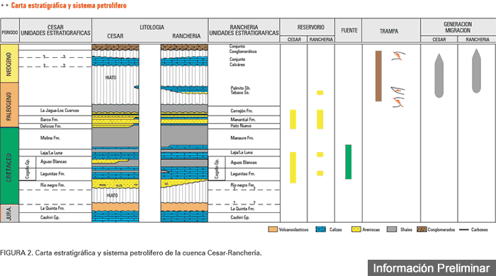 Cesar-Ranchería es una cuenca subexplorada, en la que existen algunos pozos exploratorios perforados a partir de 1947, basados en información de superficie. La adquisición sísmica comenzó apenas en 1979. Hasta el presente se han perforado 57 pozos, de los cuales cuatro han producido cantidades no comerciales de hidrocarburos.