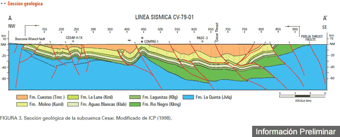 De acuerdo con las interpretaciones sísmicas, las principales trampas para hidrocarburos se encuentran en pliegues asociados a fallas de cabalgamiento (Figura 3). De igual manera, las discordancias entre las formaciones La Luna-Molino y Molino-Cerrejón, constituyen potenciales trampas estratigráficas para petróleo y gas.