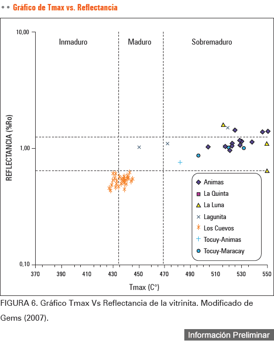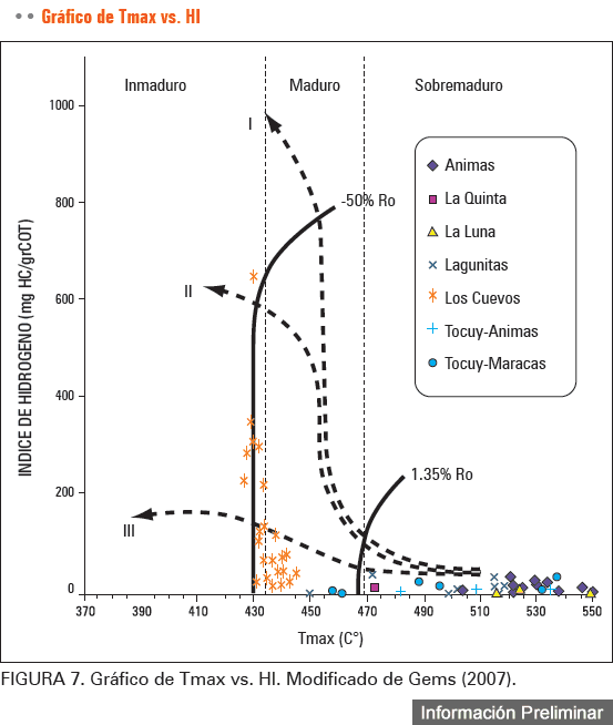 La mayoría de la secuencia estratigráfica varia geoquímicamente de madura a sobre madura (Figura 6). El kerógeno tipo II predomina en la cuenca; sin embargo las muestras podrían ser afectadas por la madurez termal (Figura 7 ). El contenido de materia orgánica de la mayoría de muestras es menor a 2%, aunque algunas muestras de las formaciones La Luna y Aguas Blancas varían entre 2 y 4%. La mayoría de las muestras muestran potencial de hidrocarburos de pobre a bueno, con valores bajo 10 mg HC/g roca.