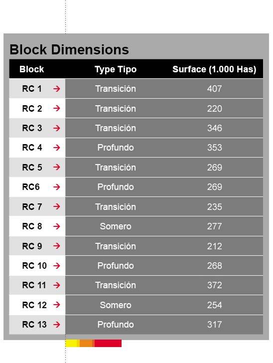 El rango de tamaño de los bloques está entre las 200.000 y las 400.000 hectáreas; el tamaño promedio es de 290.000 hectáreas por bloque.